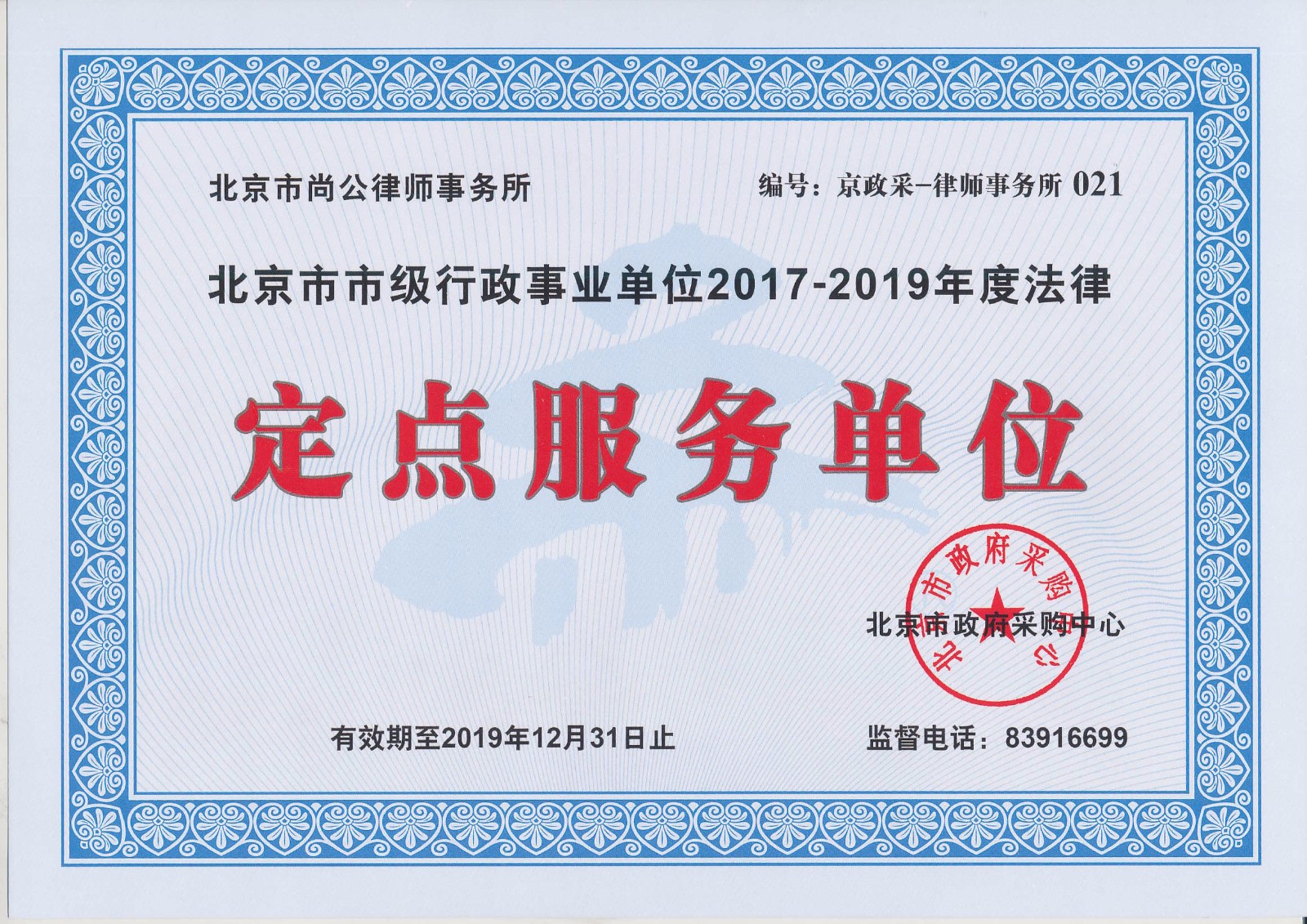 億彩成功入围北京市市级行政事业单位2017-2019年度法律定点服务机构名录
